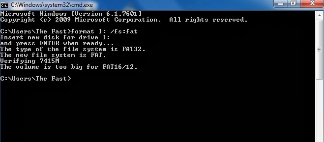 Untuk langkah-langkahnya, pertama kita masuk ke Command Prompt (cmd) bisa melalui run atau dengan menekan tombol windows + R secara bersamaan. Kemudian ketikan perintah : format I: /fs:fat